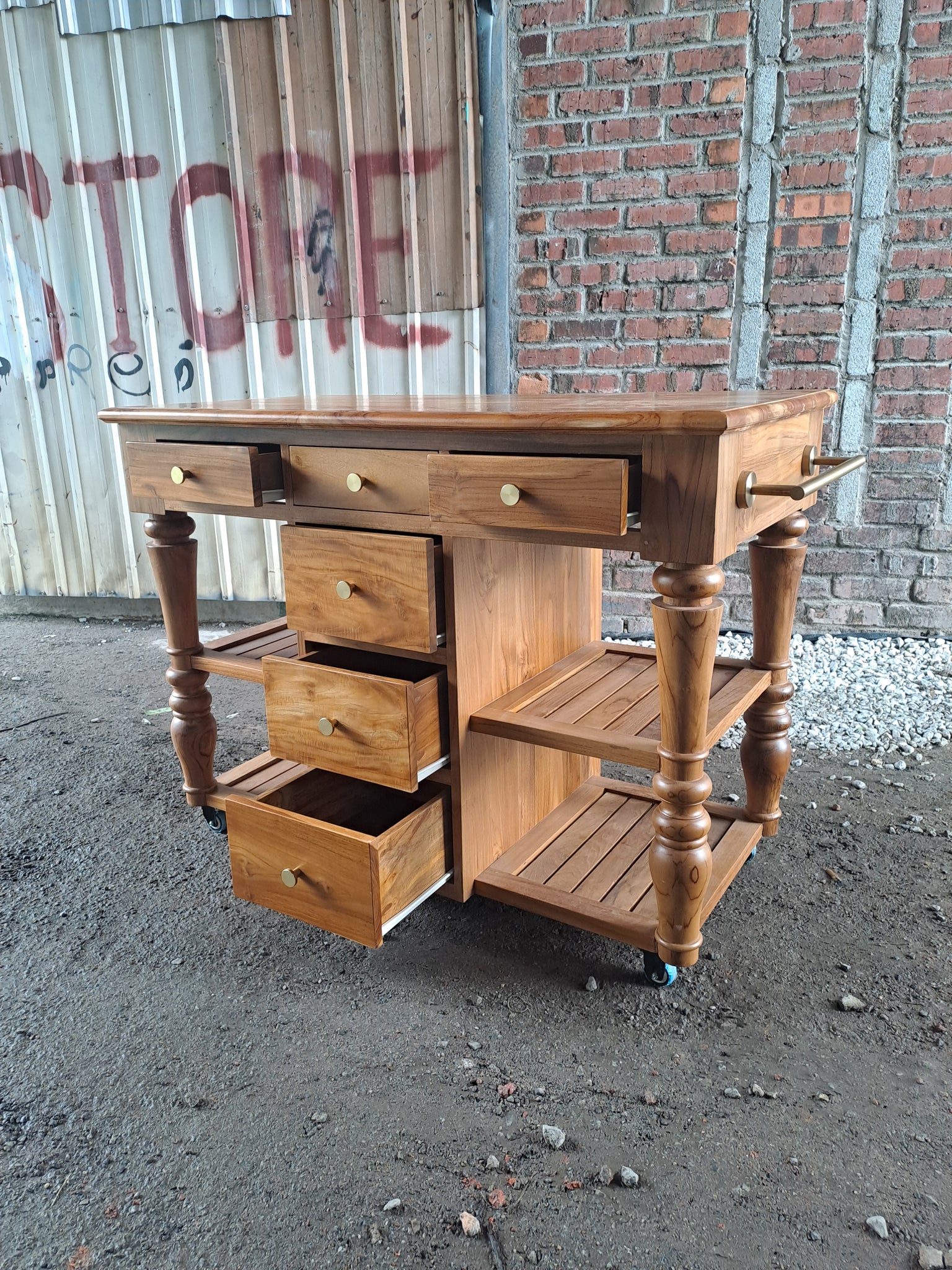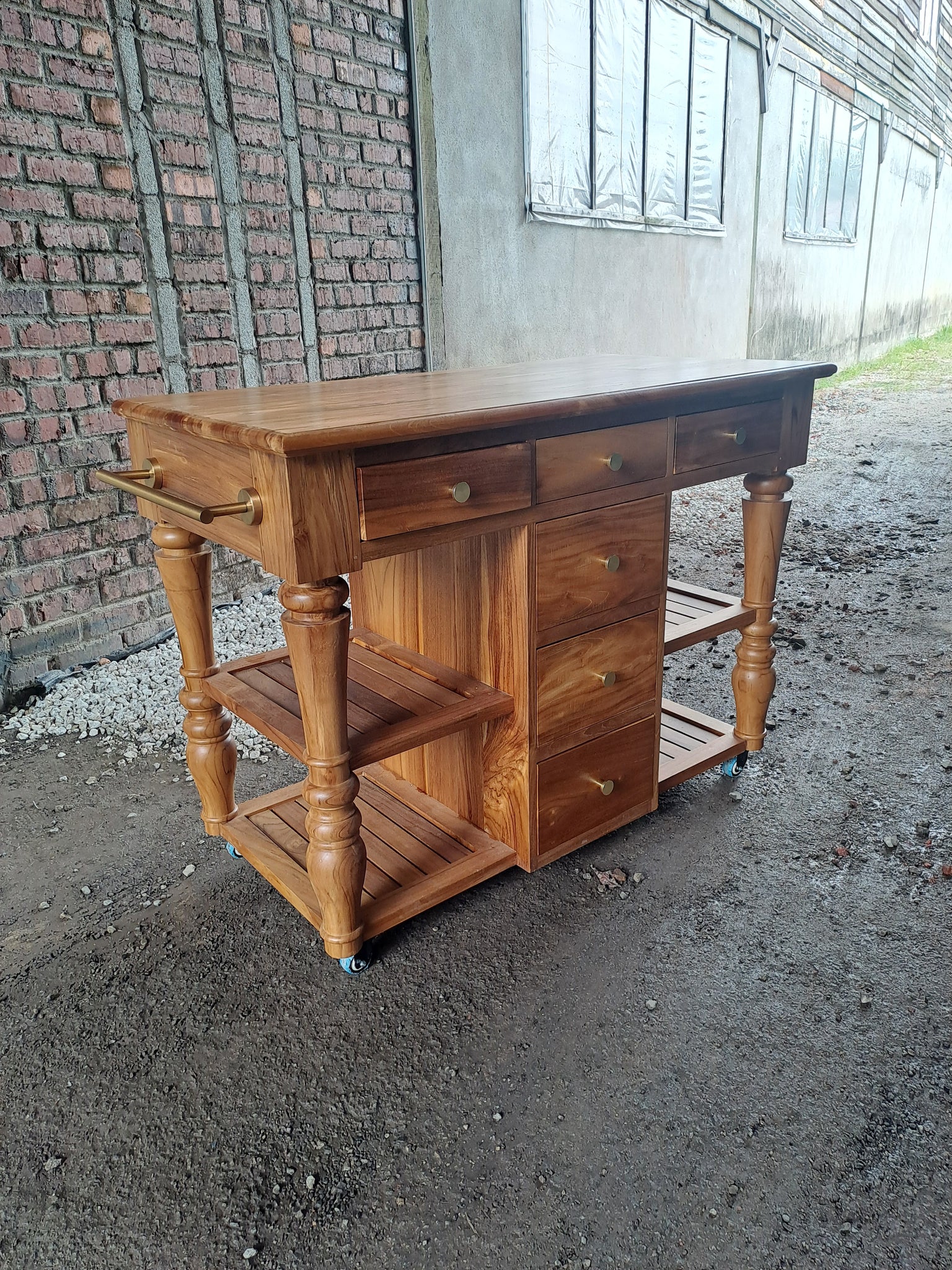 The Brighton Kitchen Island combines style with practicality, featuring a beautifully varnished finish that enhances any kitchen décor and makes cleaning stains and water spots effortless. With generous storage compartments, it keeps your kitchen essentials organized and within reach. The mobile design lets you reposition it whenever you need, adapting to your kitchen layout with ease. A versatile addition that brings both elegance and functionality to your home, plus you get to choose from a variety of knobs and handles for the drawers.