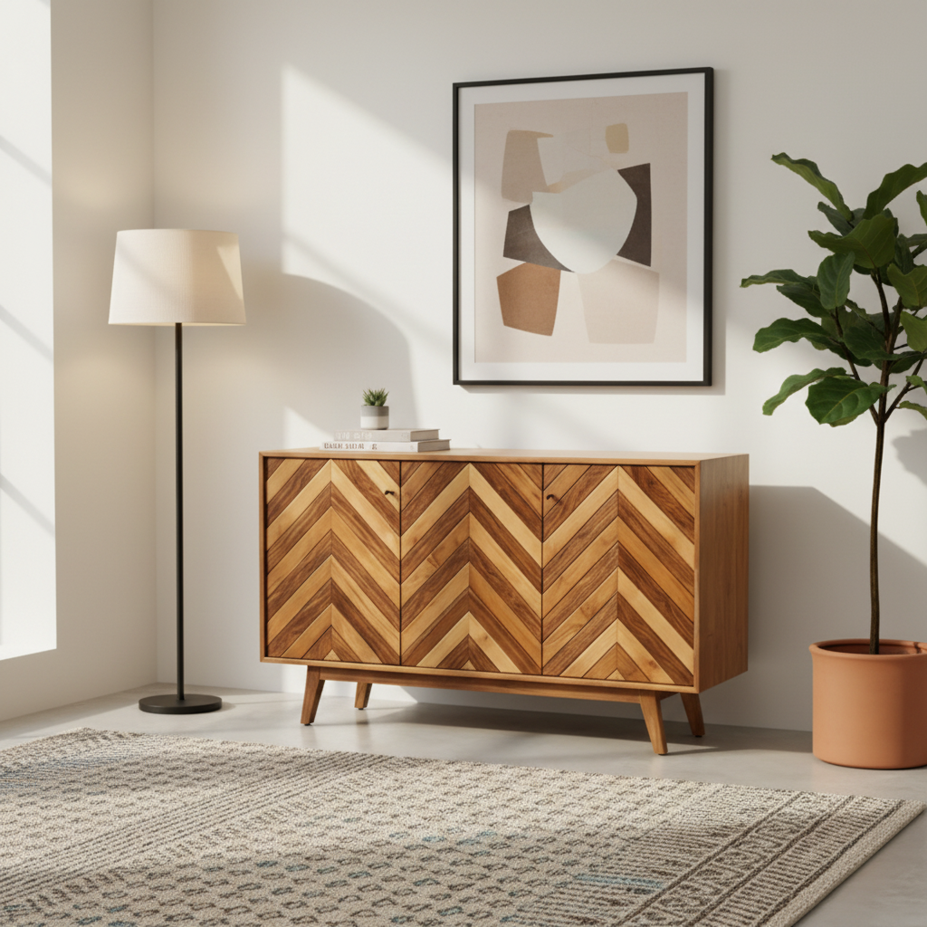 The Herringbone Sideboard (150cm) features a stunning herringbone pattern that adds timeless elegance to any space. Designed with ample storage, it keeps your essentials organized while enhancing your room’s style. Perfect for those seeking both beauty and practicality in their furniture.
