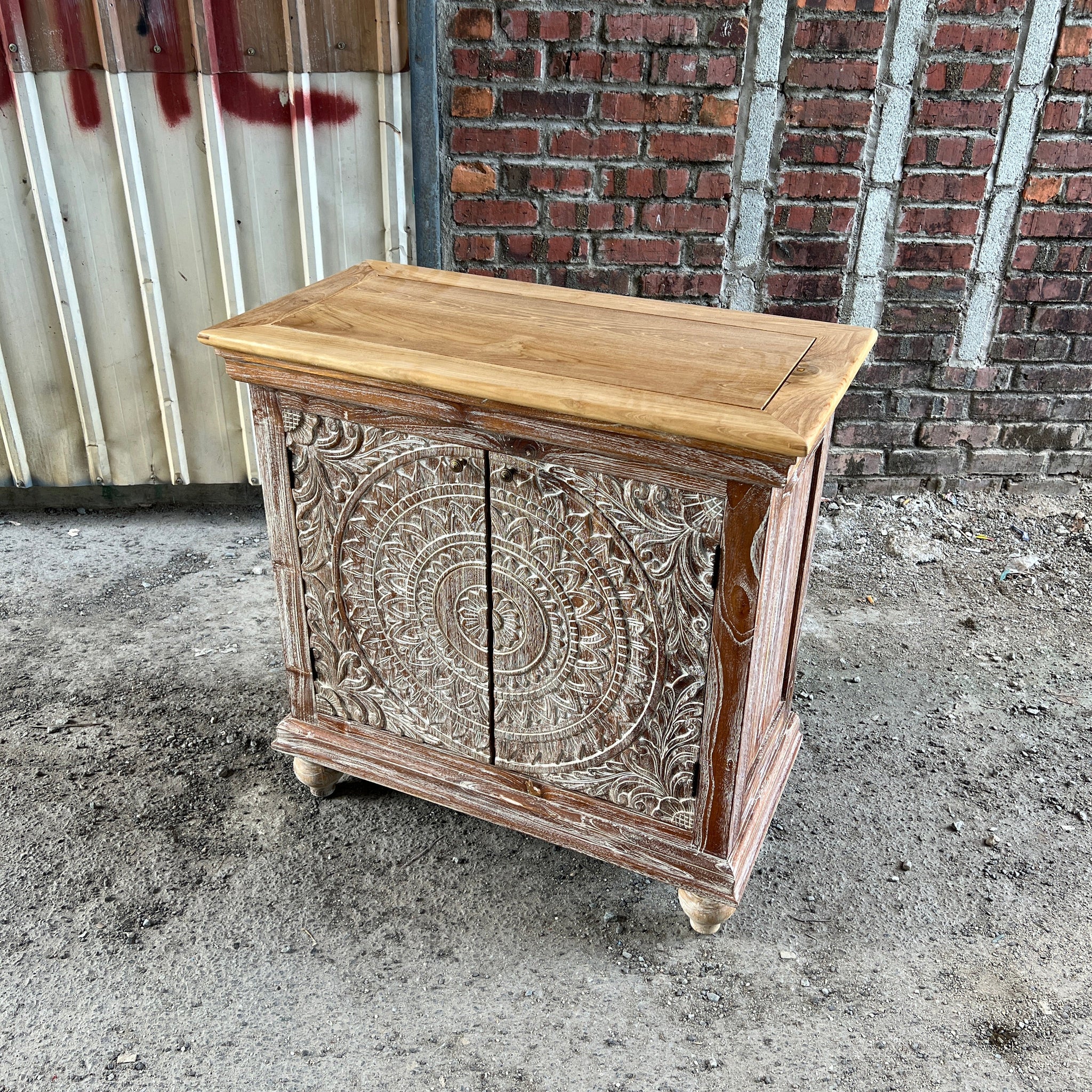 This Ornate Cabinet features beautifully intricate mandala-like carvings and a stunning whitewash finish. Add a touch of whimsy and style to any room with this unique piece of furniture. Elevate your decor with this one-of-a-kind cabinet/console.