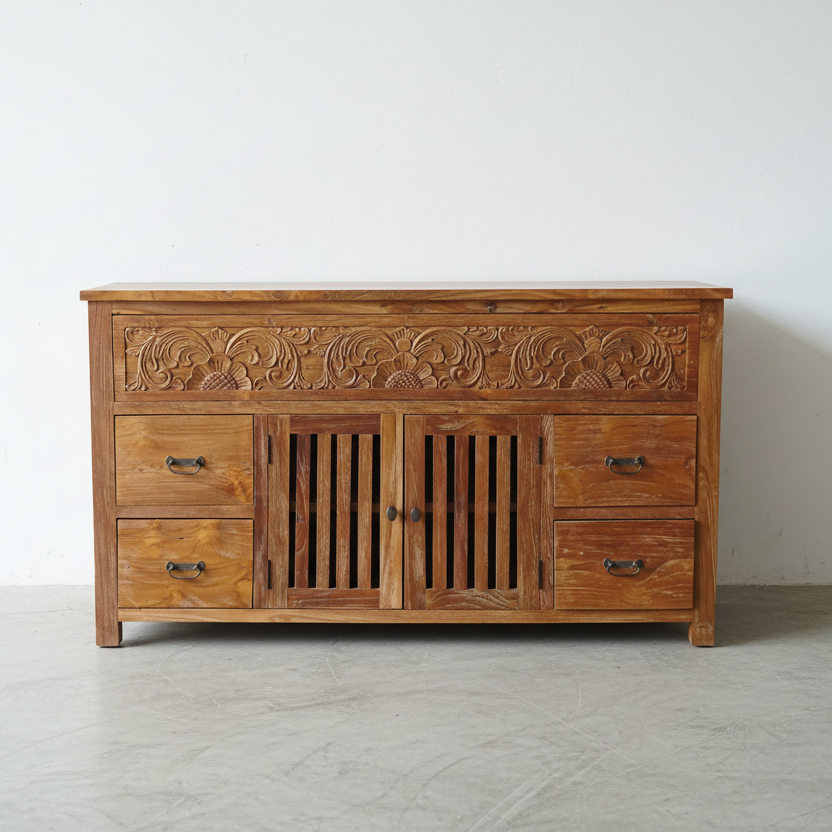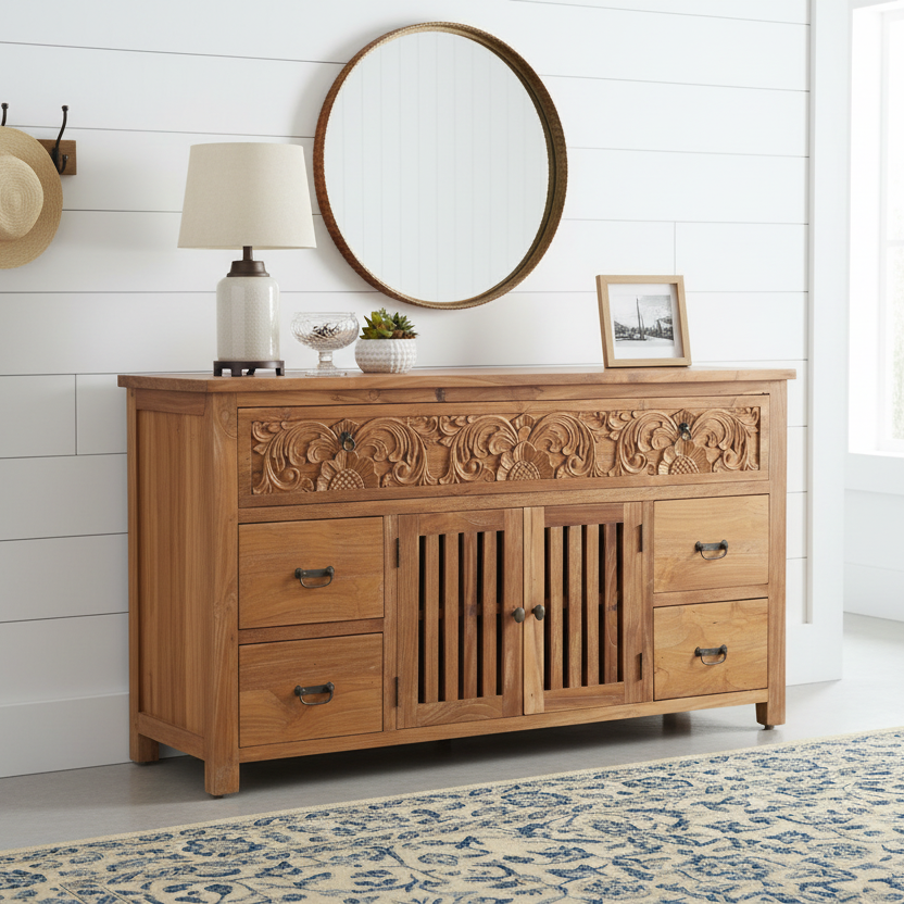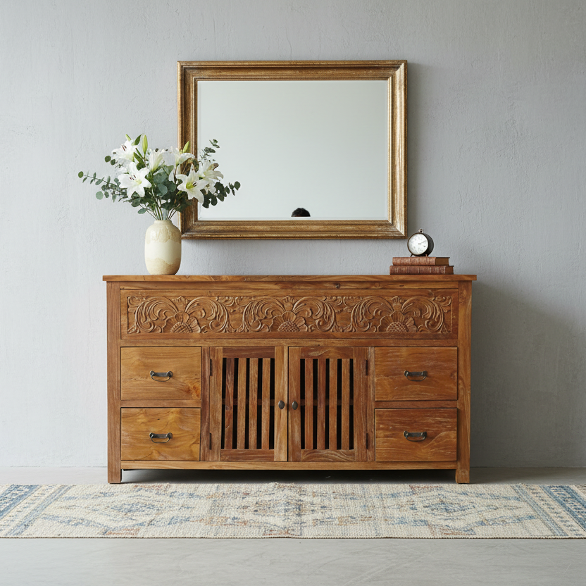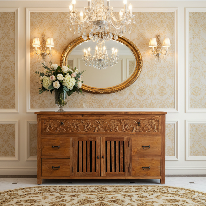 Elevate your entryway with our stunning Ornate Entry Console (140cm) Type 2. This 140cm masterpiece seamlessly blends modern functionality with rustic charm and ornate detailing. The intricate craftsmanship creates a statement piece that transforms your foyer from ordinary to extraordinary. Perfect for displaying treasured items while providing essential storage. Don't settle for bland when your home deserves distinctive character and timeless appeal.