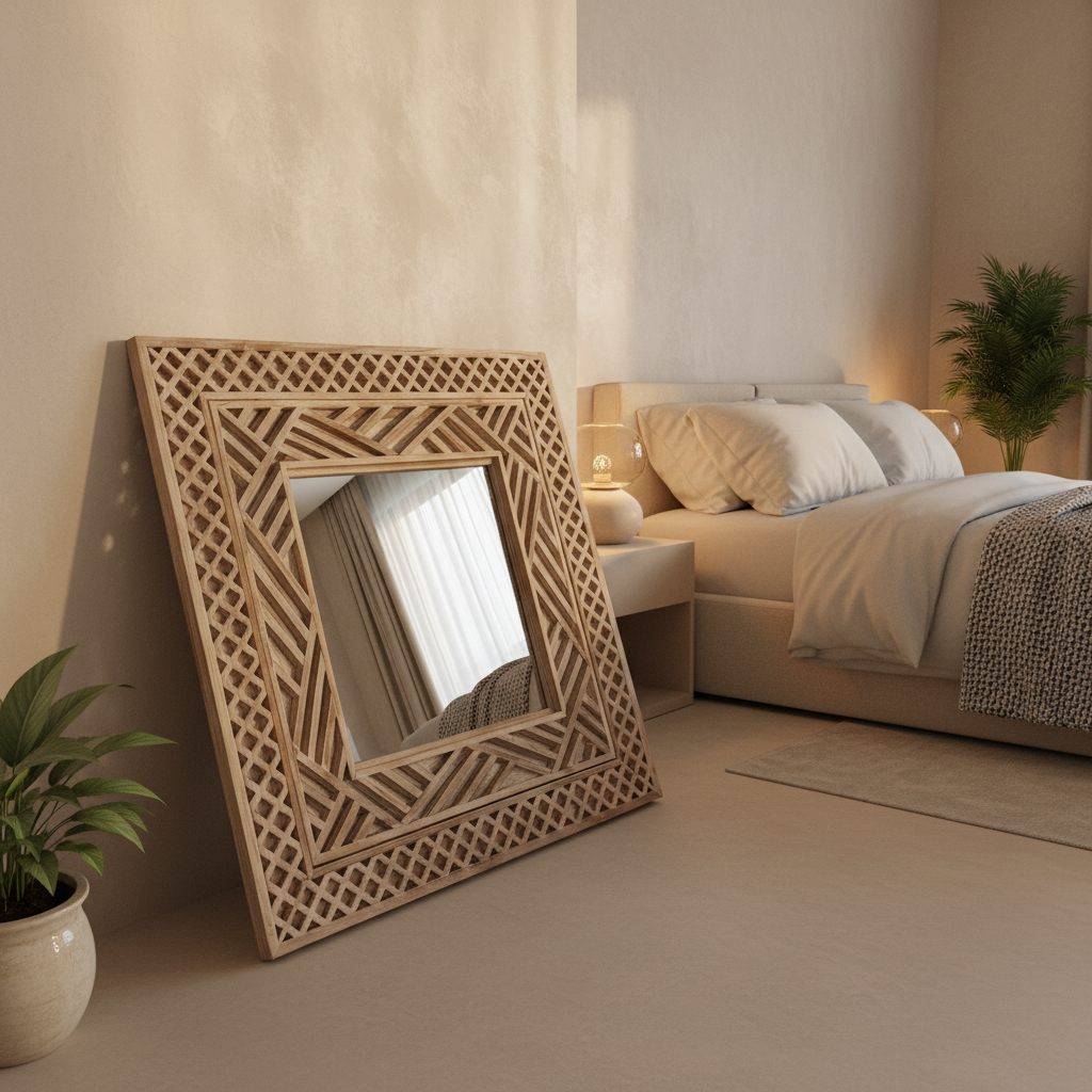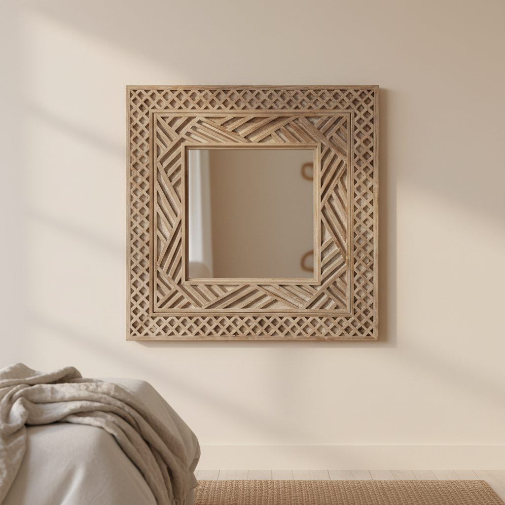 Be the envy of all your friends with this unique, whitewashed Teak mirror! Boasting an intricately carved pattern, this standout piece will brighten up any wall. It'll be a guaranteed showstopper in any setting. Time to reflect in style!